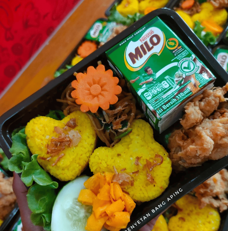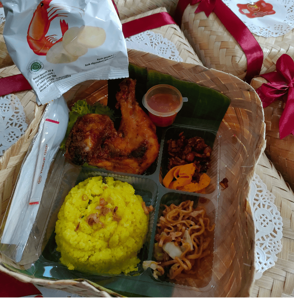 Nasi kuning yang harum berpadu dengan lauk-pauk seperti ayam suwir, perkedel, telur balado, dan sambal goreng, semuanya disusun rapi dalam kemasan praktis.